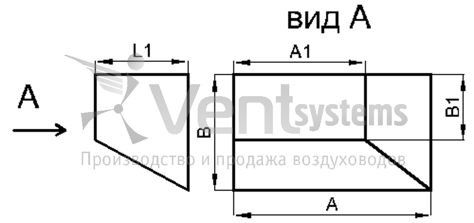 Данный переход стыкует прямоугольные воздуховоды разного размера. Смещение является угловым влево.